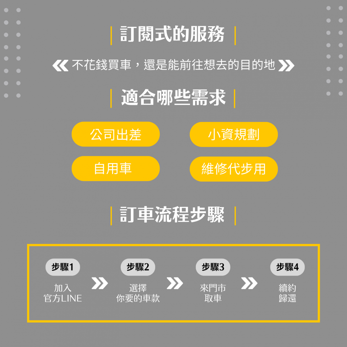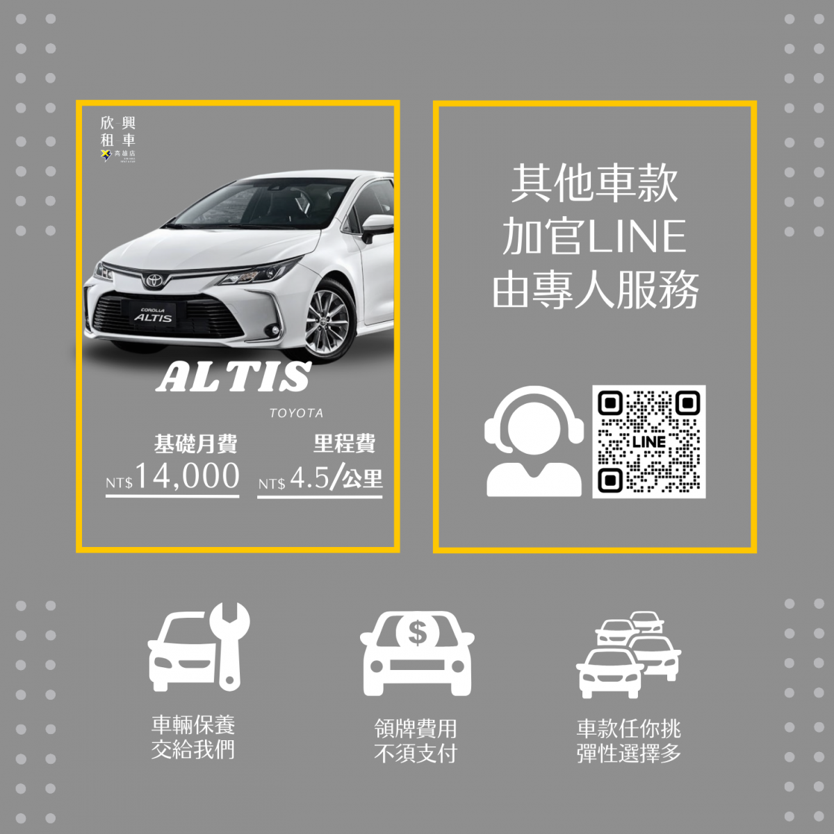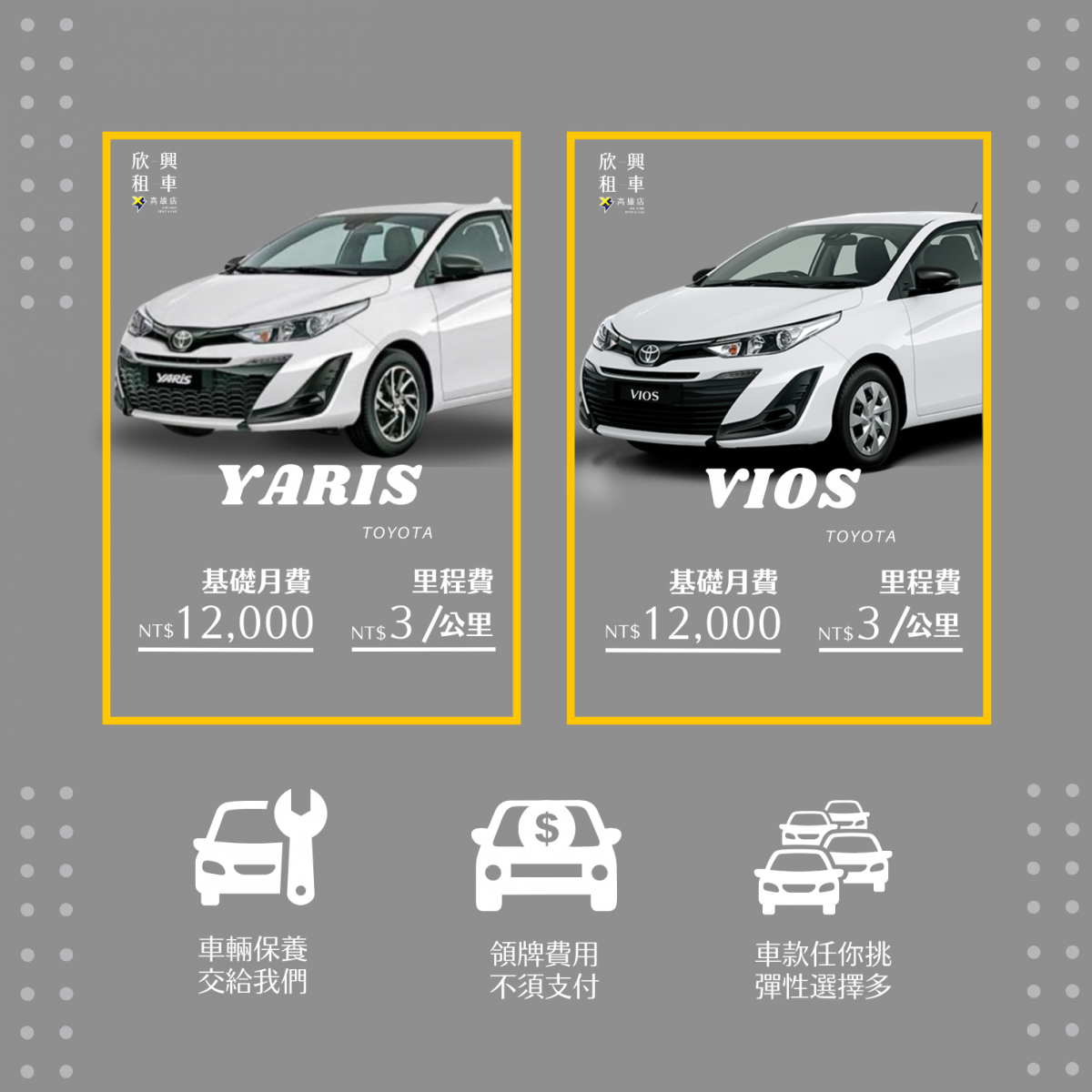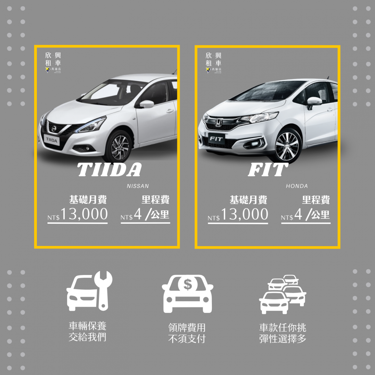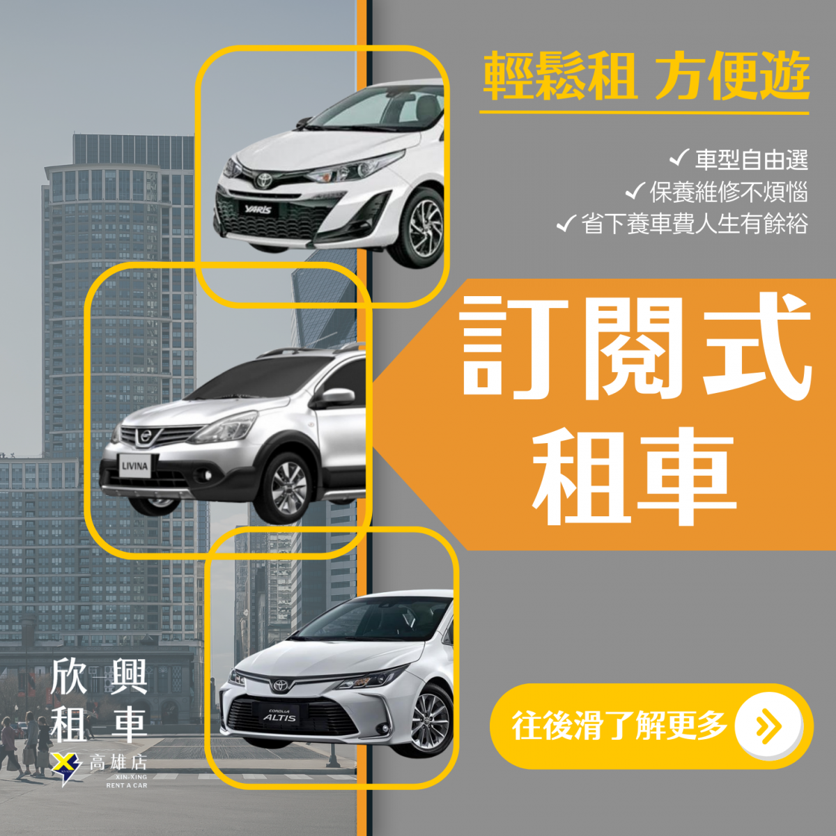 高雄欣興租車推出全新的訂閱式租車專案啦~ 無論您是公司出差、新世代小資族、自用車、維修代步用或是短暫規劃用,我們都能滿足您的汽車租車需求! 若您是因出差想要到高雄租汽車,還是來遊出遊的,都可以來參考我們的精選車款唷~